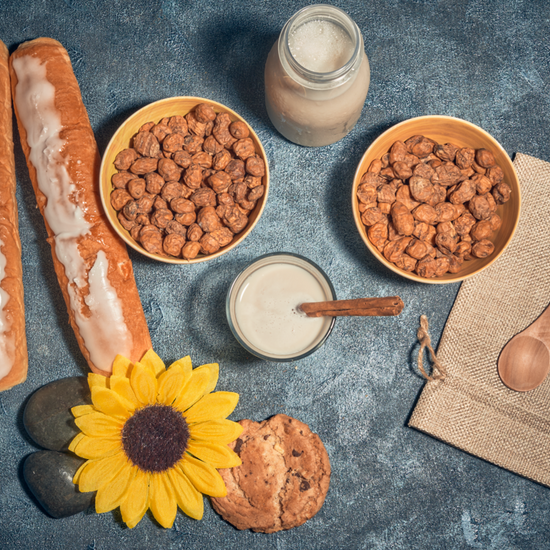 Die frischen ganzen Erdmandeln werden in einem schonenden Verfahren direkt bei uns im Haus weiterverarbeitet. Sie enthalten Ballaststoffe, Magnesium, Biothin, Calcium, Eisen und Zink. (Vitamine & Mineralien pro 100 g: Biotin (H) 7,3 µg; Calcium 103 mg; Eisen 4,4 mg; Magnesium 60 mg; Zink 34,3 mg)