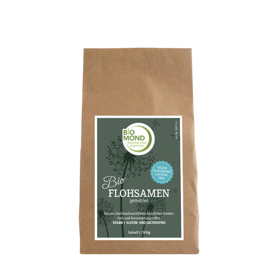Unser BIO Flohsamen gemahlen von BIOMOND sind naturbelassen und in Rohkostqualität. Flohsamenschalen sind die Schalen der Samen einer Pflanze, deren lateinische Bezeichnung Plantago ovata ist. Die schwarzen Flohsamen sind kleine, dunkelbraun glänzende Samenkörner, dem Leinsamen ähnlich. Flohsamen sind ein wertvoller Beitrag zur ballaststoffreichen Ernährung. Flohsamen enthalten Psyllium. Der wasserlösliche Ballaststoff hat ein großes Quellvermögen. Die in den Flohsamenschalen enthaltenen pflanzlichen Ballaststoffe sind in der Lage, mehr als das 50-fache an Wasser zu binden.